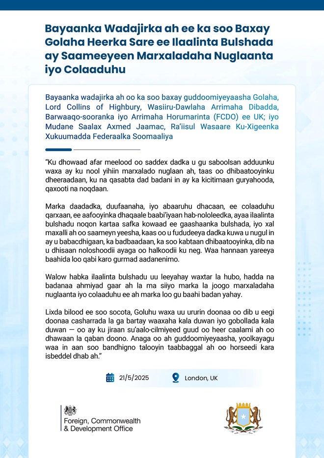 Khamiis, May 22, 2025 (HOL) - Dowladaha Soomaaliya iyo UK ayaa magaalada London waxa ay si wadajir ugu shir gudoomiyeen madal heersare ah oo ku saabsan ilaalinta bulshada ay saameeyeen marxaladaha nuglaanta iyo colaaduhu.