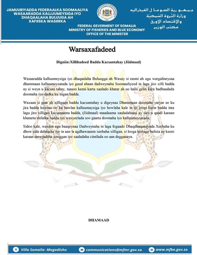 "Waxaan si gaar ah xilligaan baddu kacsantahay u digeynaa Dhammaan doomaha yaryar ee ku jira badda kuwaas oo ku hawlan kalluumaysiga iyo howlaha kale in sii joogi karin badda inta lagu jiro xilligan kacsanaanta badda, (Jiidmaal) maadaama xaaladahaasi ay sare u qaadi karaan khatarta shilalka badda iyo waxyeelada soo gaarta doomaha iyo kalluumeysatada." ayaa lagu yiri war saxaafadeedka Wasaaradda.