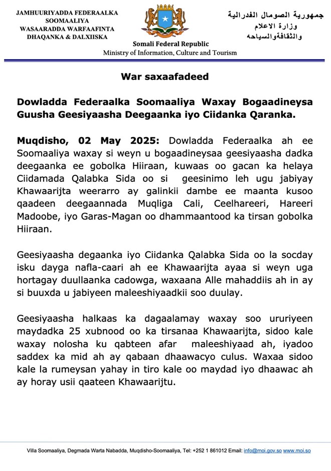 Sabti, May 3, 2025 (HOL) - Dowladda Federaalka Soomaaliya ayaa si weyn u bogaadisay guulo la taaban karo oo ciidanka difaaca deegaanada ee Macawiisleeyda Hiiraan ka gaareen dagaalo qaraar oo galinkii dambe ee shalay ka dhacay deegaano ka tirsan gobolka Hiiraan.
