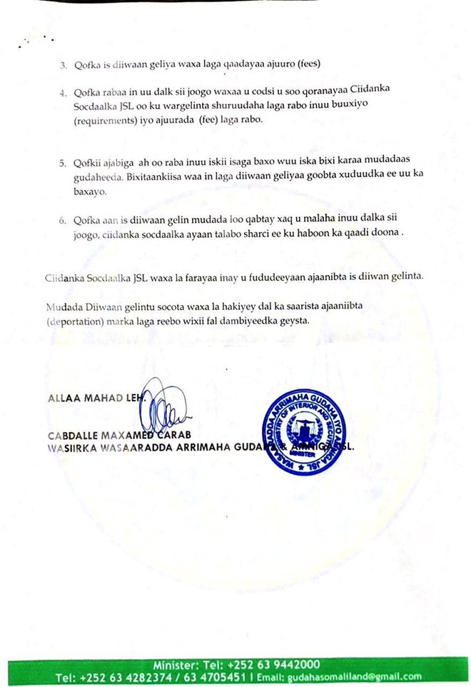 Warsaxaafadeed kasoo baxay Wasaaradda Arrimaha Gudaha Somaliland ayaa lagu amray dhammaan ajaanibta aan sharciga haysanin in ay iska diiwaangeliyaan waaxaha laanta socdaalka. Dadka isdiwaangaliya ayaa la siin doonaan degenaansho.