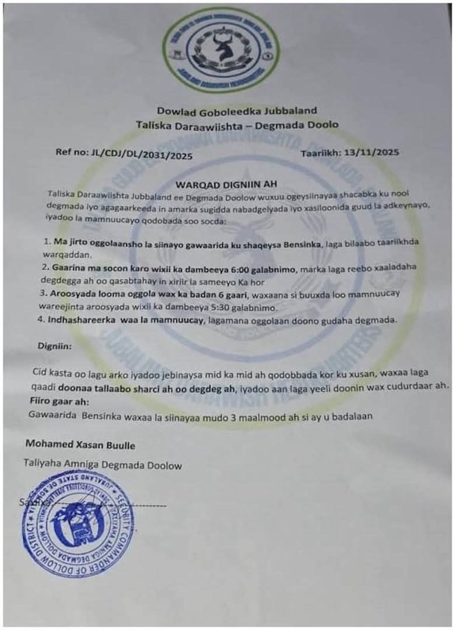 Jimco, November 14, 2025 (HOL) - Taliska Daraawiishta Jubbaland ee degmada Doolow ayaa soo saaray amarro cusub oo ku socda bulshada ku nool degmada iyo deegaannada ku hareeraysan, kuwaas oo lagu xoojinayo amniga iyo xasilloonida guud ee deegaanka.