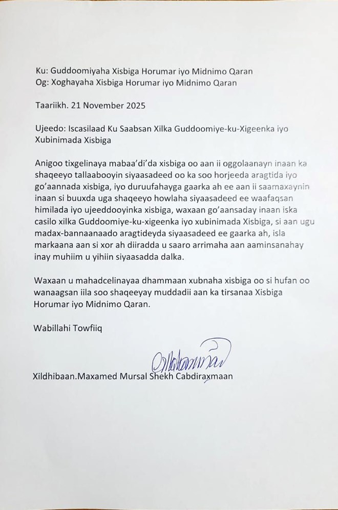 Jimco, November 21, 2025 (HOL) - Guddoomiyihii hore ee Baarlamaanka Federaalka Soomaaliya, Maxamed Mursal Sheekh Cabdiraxmaan, ayaa maanta shaaciyay inuu iska casilay xilkii iyo xubinimadii uu ka hayay Xisbiga Horumar iyo Midnimo Qaran.