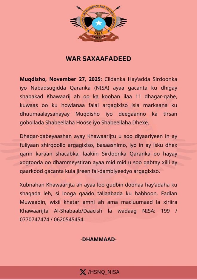 Khamiis, November 27, 2025 (HOL) - Hay’adda Sirdoonka iyo Nabad Sugidda Qaranka (NISA) ayaa maanta shaacisay inay gacanta ku dhigtay shabakad Al shabaab ah oo ka koobnayd illaa 11 dagaalame, kuwaas oo ku lug lahaa qorsheyaal argagixiso, basaasnimo iyo dhirbaaxo nabadgelyo oo ay ka wadeen magaalada Muqdisho iyo deegaano kale oo ka tirsan gobollada Shabeellaha Hoose iyo Shabeellaha Dhexe.
