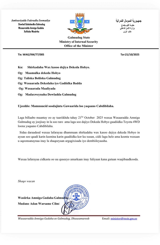 newsinside“Wasaaradda amniga Galmudug ayaa maanta, 21-ka October 2025, ku dhawaaqday mamnuucid lagu soo dejinayo gawaarida nooca Toyota 4WD ee loo yaqaan Cabdibilaha, iyadoo laga bilaabo maanta aan la ogolaan doonin in lagu soo raro ama laga soo dajiyo dekedda Hobyo” ayaa lagu qoraalka soo baxay.
