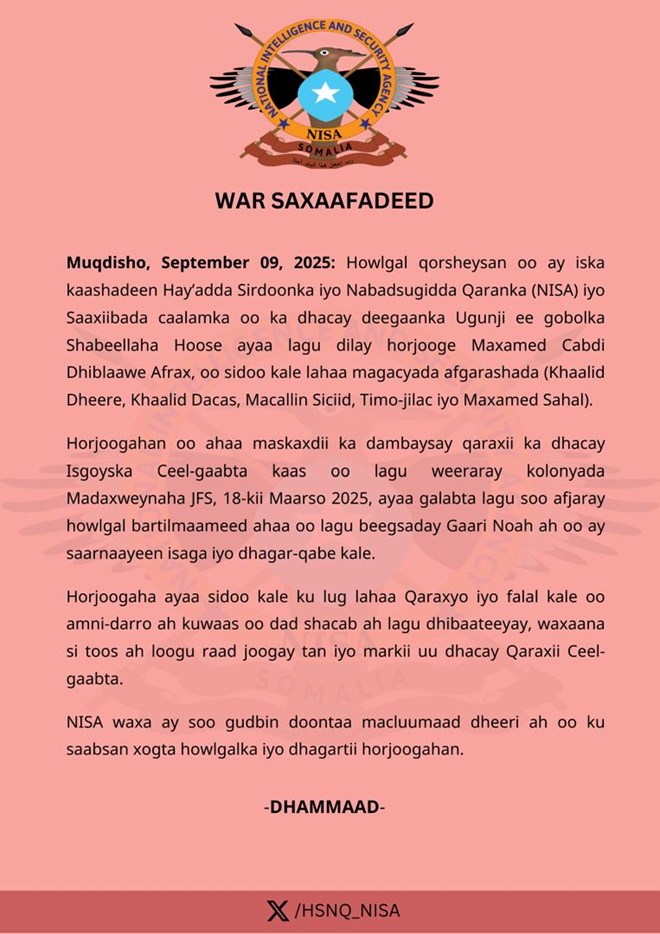 Arbaco, September 10, 2025 (HOL) - Warsaxaafadeed ka soo baxay hay’adda Nabadsugida iyo Sirdoonka Qaranka ee NISA ayaa lagu sheegay in howlgal qorsheysanaa oo Shalay galinkii dambe ka dhacay deegaanka Ugunji ee gobolka Shabeellaha Hoose lagu dilay horjooge sare oo ka tirsanaa kooxda Al-shabaab.