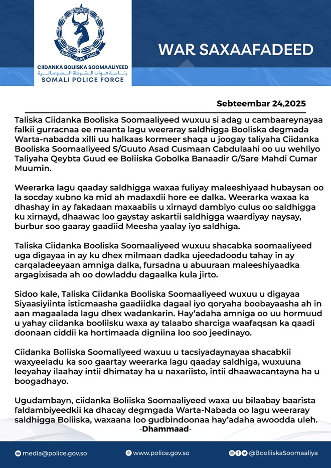 Khamiis, September 25, 2025 (HOL) - Taliska ciidanka Booliska Soomaaliyeed ayaa faahfaahin dheeraad ah ka bixiyay iska hor imaadkii Shalay ka dhacay afaafka hore ee Saldhiga Warta Nabadda ee dhexmaray ciidamada dowladda iyo kuwa taabacsanaa xubnaha siyaasiyiinta Mucaaradka.
