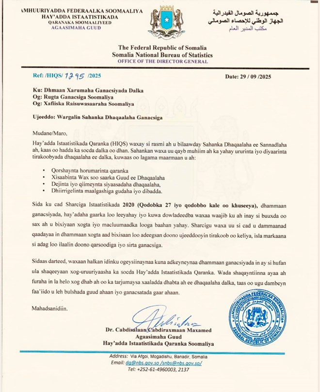 Talaado, September 30, 2025 (HOL) - Hay’adda Istaatistikada Qaranka Soomaaliya ayaa ku dhawaaqday bilaabidda sahanka sannadlaha ah ee dhaqaalaha ganacsiga oo laga sameynayo guud ahaan dalka.