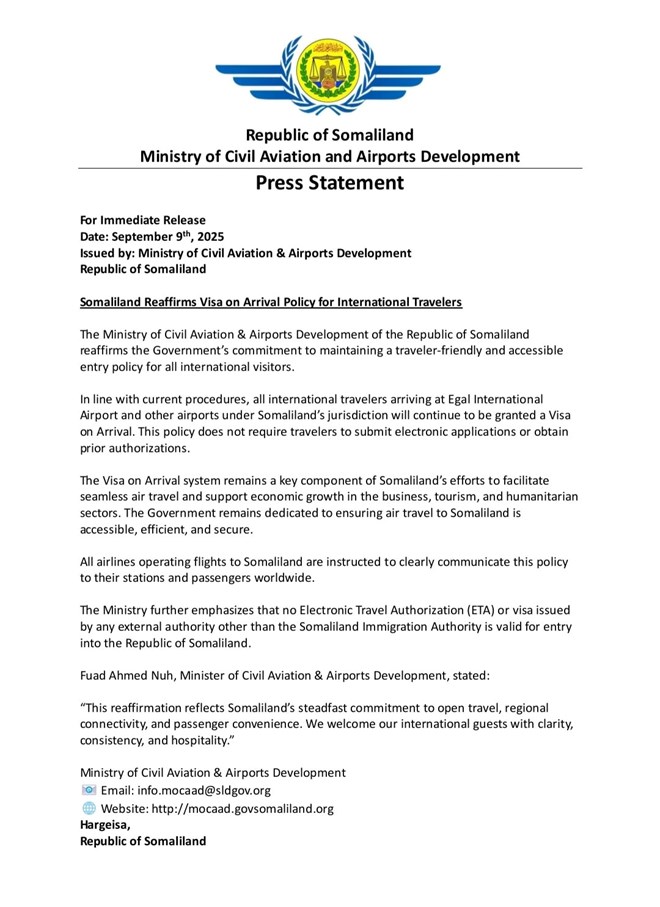 Talaado, September 9, 2025 (HOL) - Xukuumadda Somaliland, oo ka jawaabaysa nidaamka fiisaha danabaysan (E-Visa) ee ay dowladda Soomaaliya ku amartay in dadka Soomaaliya u socdaalaya ku dalbadaan dal-ku-galka, ayaa dhankeeda sheegtay in ay dhaqan-galisay Siyaasadda Dal-ku-galka Furan (Visa On Arrival Policy).