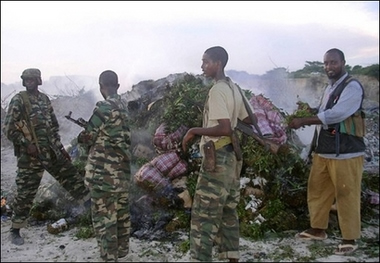Somali Islamist security men stand guard by a consignment of the popular narcotic leaf khat on November 16, imported from Ethiopia by a business woman at Mogadishu airport. Somalia's powerful Islamist movement has slapped a total ban on khat after breaking up a protest against such plans in which at least two people were killed.(AFP)