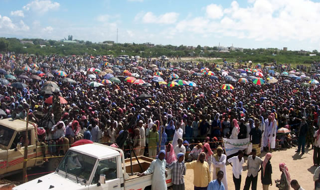 Addressing the Mogadishu crowd, Islamist leader Sheikh Sharif Ahmed urged Somalis to hand over their weapons.