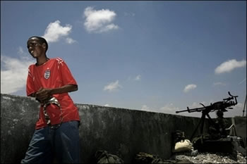 | Ahmed, 17, stands on the roof of a building occupied by the African Union troops to monitor the situation in the center of the Somali capital Mogadishu 24 March 2007. Hundreds of families took advantage today of a rare period of calm to flee the Somali capital after deadly clashes last week which claimed 24 lives. At the K4 junction of southern Mogadishu, a Ugandan contingent of African Union peacekeepers deployed to help government troops regain control, held their positions, some on top of buildings.(AFP/Jose Cendon) |