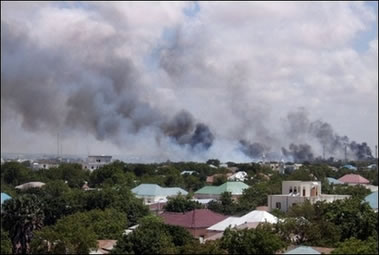 | Smoke rises in the horizon above the Towfiq neighborhood in Mogadishu. Ethiopian helicopters have fired missiles on southern Mogadishu as heavy fighting across the Somali capital left 10 people dead in an offensive against insurgent fighters.(AFP/Mustafa Abdi) |