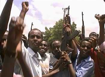 | Somali insurgents raise their AK-47 rifles in celebration as they roam through Shirkole neighbourhood in Mogadishu March 29, 2007. REUTERS/Shabelle Media |