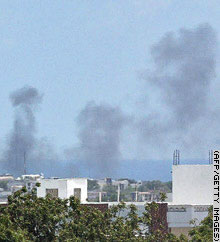 | Smoke rises from the vicinity of the International Airport of Mogadishu on Friday where an Ethiopian helicopter was reportedly shot down by insurgents. |