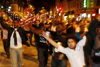 At 10 p.m. Tuesday, when the major networks projected that Barack Obama had won the presidency, Sharmarke Hamud, 19, and his five roommates grabbed an American flag and hit the streets.