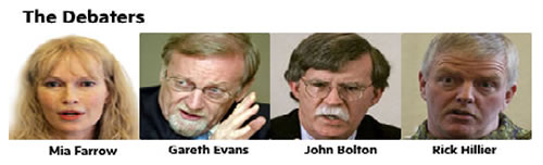 The debaters are Mia Farrow, Gareth Evans, John Bolton and Rick Hillier.