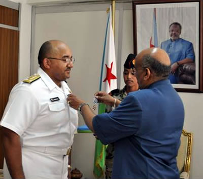 U.S. Navy Surgeon General Vice Adm. Adam M. Robinson Jr. is presented with the Djibouti Medal of the Commander of the National Order, the nation's highest award, by Djibouti Prime Minister Dileita Mohamed Dileita. Robinson accepted the award on behalf of the U.S. Navy Medical Research Unit-3 (NAMRU-3) whose work over the past decade has enhanced infectious disease surveillance within Djibouti. (U.S. Navy photo by Capt. Cappy Surette/Released)