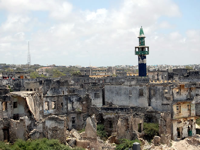 The ragged structure, with its bloodstained hallways, is used now by peacekeepers to defend Mogadishu's port. The troops, mainly soldiers from Uganda, take up position and scan the city's broken skyline, trading sniper fire with the militants.