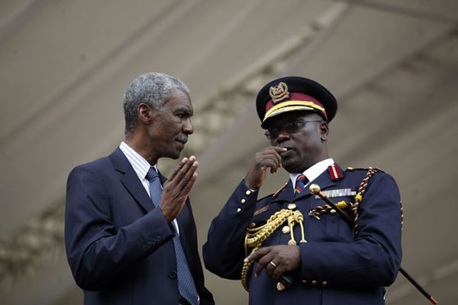 National Security Intelligence Service Director Michael Gichangi (left) and Inspector General of Police David Kimaiyo. Security agents are on high alert after intelligence reports indicated that Al-Shabaab militants were planning attacks in Kenya and other African countries with their soldiers to Somalia. PHOTO | EVANS HABIL | FILE