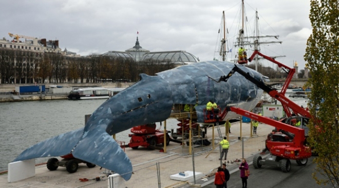 Workers construct a giant whale sculpture along the side of the river Seine on November 29, 2015, in Paris, on the eve of the COP21 United Nations conference on climate change/AFP