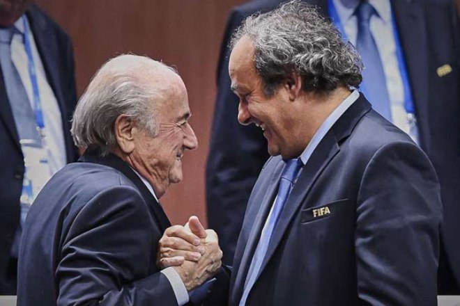 A file picture taken on May 29, 2015 shows Fifa President Sepp Blatter (left) shakes hands with Uefa president Michel Platini after being re-elected following a vote to decide on the Fifa presidency in Zurich. Blatter and Platini have been banned for eight years by a Fifa ethics committee. PHOTO | MICHAEL BUHOLZER | AFP