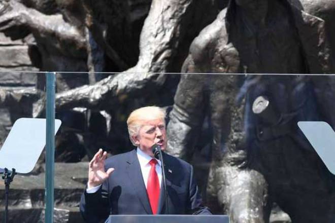 US President Donald Trump gives a speech in front of the Warsaw Uprising Monument on Krasinski Square during the Three Seas Initiative Summit in Warsaw, Poland, July 6, 2017. AFP PHOTO | JANEK SKARZYNSKI