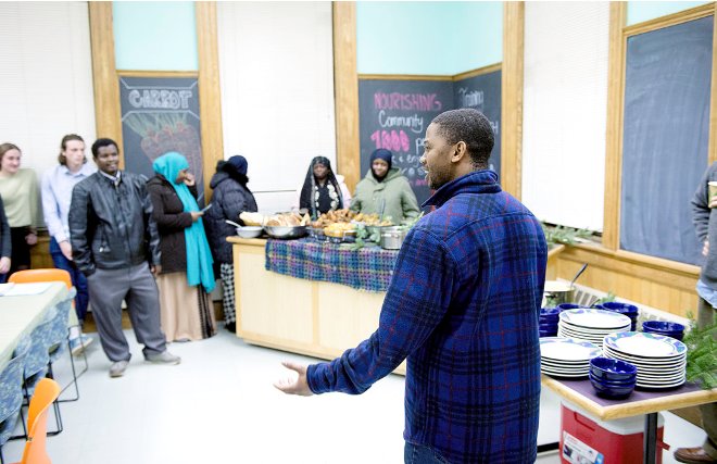 Mohamed Dekow introduces the women who prepared the evening meal at the St. Mary’s Nutrition Center in Lewiston on Tuesday. (Daryn Slover/Sun Journal)