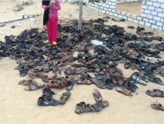 Discarded shoes of victims remain Saturday outside al-Rawda mosque in Bir al-Abd in northern Sinai, Egypt, a day after attackers killed hundreds of worshipers. The assault was Egypt’s deadliest attack by Islamic extremists in the country’s modern history, a grim milestone in a long-running fight against an insurgency led by a local affiliate of the Islamic State group. (AP)