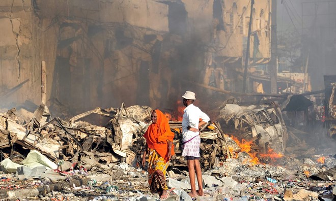 A man and woman look at the damage on the site of the explosion of a truck bomb in the centre of Mogadishu. Photograph: Mohamed Abdiwahab/AFP/Getty Images