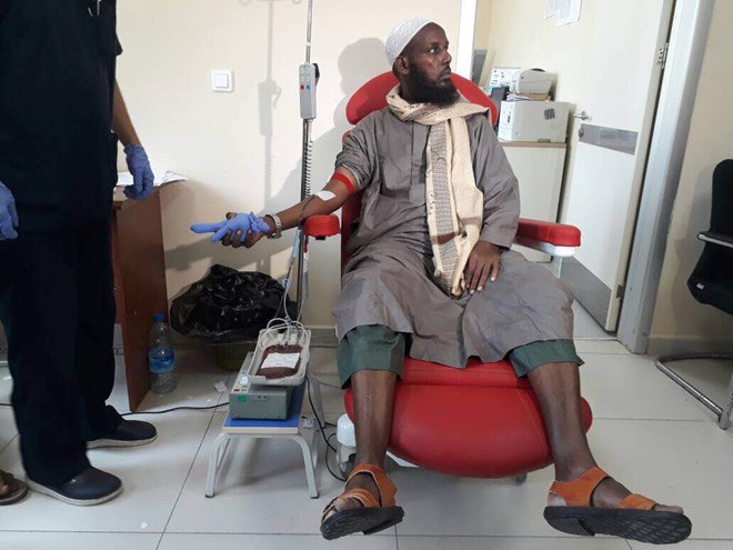 Mukhtar Roobow, One of the co-founders of Al-Shabaab donating blood to victims of Oct 14 terrorist attack in Mogadishu. PHOTO: TWITTER