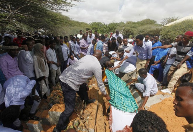 In a sandy cemetery at one Mogadishu hospital, mourners carried the coffin of a woman killed in Saturday's massive truck bombing. The crowd prayed in low voices under the scorching sun.