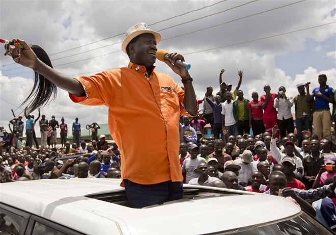 Opposition leader Raila Odinga greets his supporters after attending a church service in the slum of Kawangware in Nairobi, Kenya, on Oct. 29, 2017. (Darko Bandic/ Associated Press)