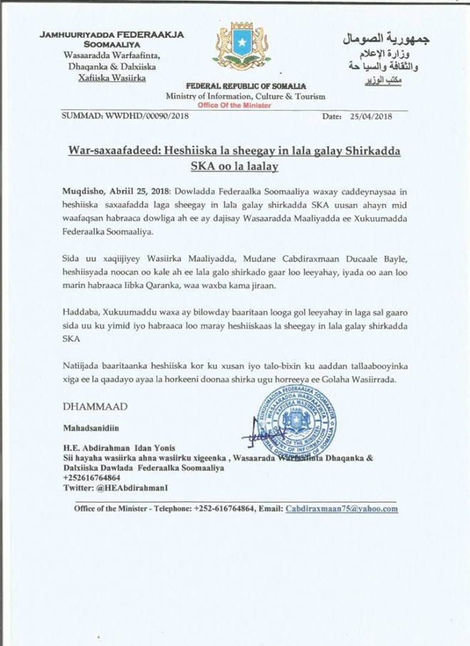 In a statement, Deputy Somali Minister, Abdirahman Yunis Iidan declared the logistics contract with the SKA as null and void.
