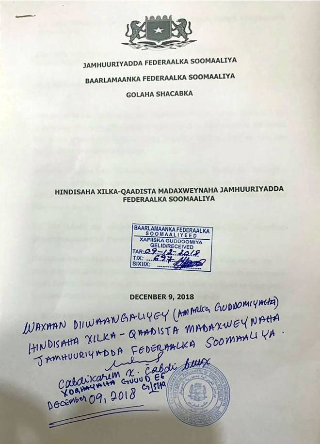 "We have filed an impeachment against the president of the federal republic of Somalia," Abdikarim H. Abdi Buh said in a statement.