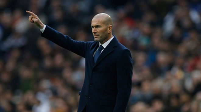 Zinedine Zidane poses with the Champions League trophy after the 2018 final against Liverpool.