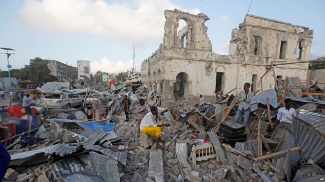 Locals walk through debris of a destroyed building following a twin car bomb attack in the capital Mogadishu, Somalia, Feb. 24, 2018.