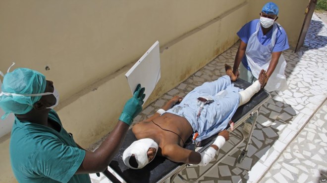 Medical workers attend to a man injured in a mortar shell attack, at Medina hospital during Somali Independence day ceremony in Mogadishu, Somalia, July 1, 2018.