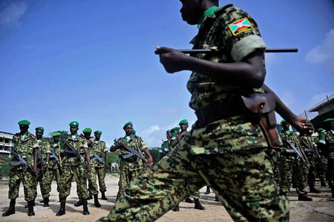 African Union soldiers from Burundi stand to attention in Mogadishu on July 11, 2017. Amisom has 22,000 soldiers with Kenya contributing 3,664 soldiers. PHOTO | MOHAMED ABDIWAHAB | AFP