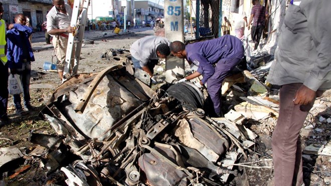 The car was parked on the Maka Al-Mukarama road and went off about 3:20 p.m. local time near the Waberi district police station. The militant group al-Shabab claimed responsibility.Somali police say four people were killed and five others were injured.