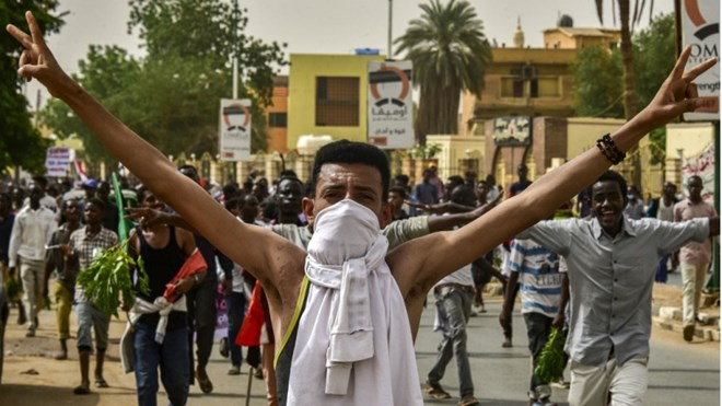 Ahmed Mustafa, AFP | A Sudanese protester covering his face with a jersey flashes the victory gesture while marching with others in a mass demonstration against the country's ruling generals in the capital Khartoum's twin city of Omdurman on June 30, 2019