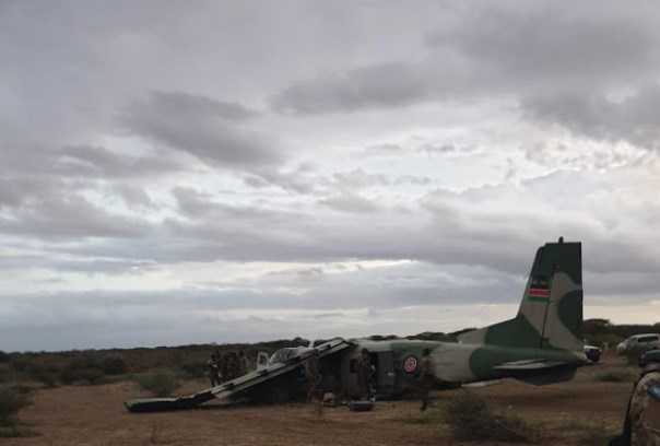 A Kenya Defence Forces aircraft crash landed at Dhobley Airstrip, Somalia, on Monday on take off to Nairobi.