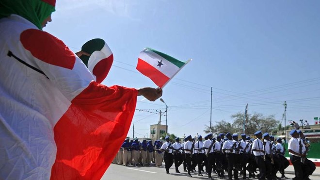 A woman waves a Somaliland flag as soldiers and other military personnel march past during an Independence Day celebration parade in the capital, Hargeisa. File | AFP
