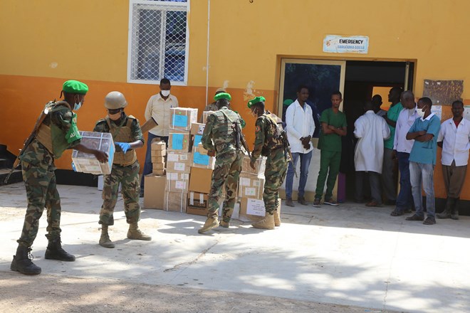 Djiboutian soldiers serving under the African Union Mission in Somalia (AMISOM) offload an assortment of medical supplies donated to Beletweyne General Hospital in HirShabelle state of Somalia to benefit local communities on 9 July 2020. AMISOM Photo
