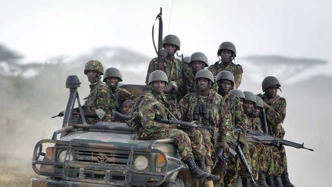 Kenyan army soldiers ride in a vehicle at their base in 2012. On Saturday, authorities in Kenya blamed Somali militant group al-Shabab for a blast that reportedly left 10 police officers dead. PHOTO BY BEN CURTIS AP