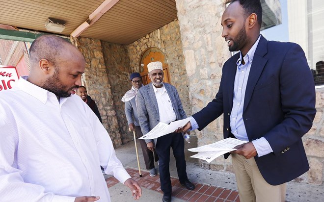 Essa Mohamed, right, a pre-doctoral student at Mayo Graduate School, hands out informational flyers about measles vaccinations outside Masjed Abubakar Siddiq on Thursday, May 4, 2017, in downtown Rochester. (Andrew Link / [email protected])