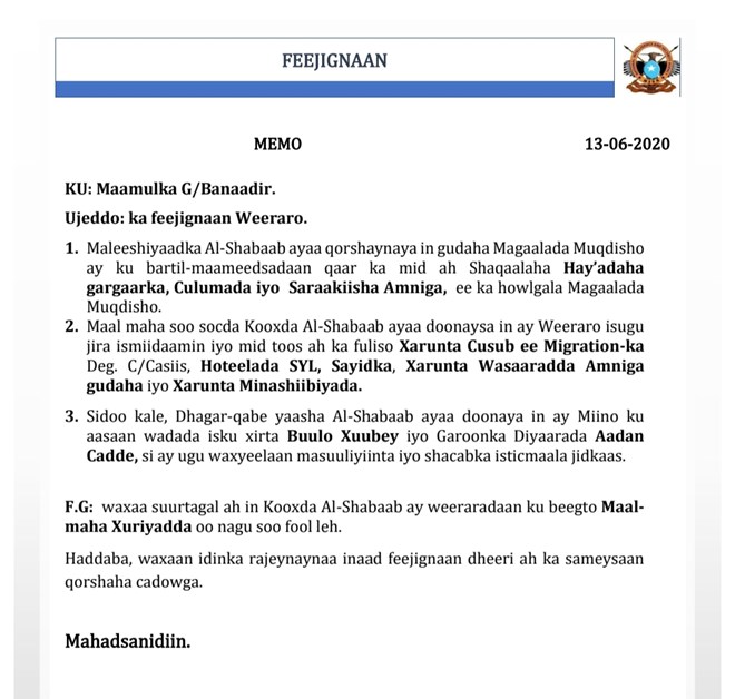 In a memo dated June 13 addressed to Banaafir regional government and seen by HOL, the al-Qaeda allied group is targeting upcoming celebrations to mark the 20th anniversary of the Arte Conference.