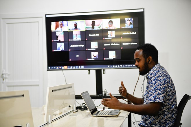 The impact of COVID-19 in Somalia is wide-ranging, including on the way people work in some industries. To contain the virus’ spread, some organizations and companies have adopted various workplace social distancing measures or issued work-from-home directives to their employees. Shown here, Awil Osman of Mogadishu's technology and innovation hub iRISE, attends a virtual meeting with his co-workers.