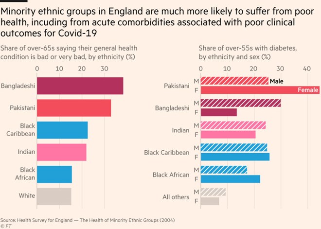 Members of both the Somali and much larger Bangladeshi communities in east London are prone to long-term health conditions, such as diabetes and high blood pressure — co-morbidities that increase the dangers of Covid-19. They tend to live in intergenerational households, with a more mobile younger generation becoming inadvertent vectors for infection.