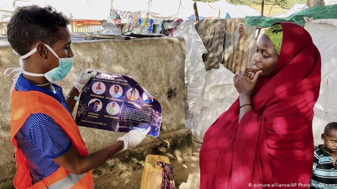 A health worker explains to an internally-displaced Somali woman in Mogadishu how to protect herself from coronavirus