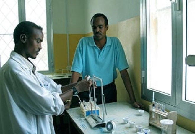 Dr Abdinasir Mohamoud Abubakar (right) with a medical technician testing blood from blood donors at Bossaso Hospital. © UNHCR/K.McKinsey